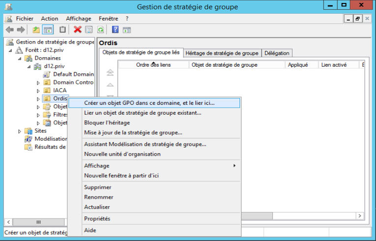 En vous plaçant sur l'OU qui contient ou qui contiendra les ordinateurs, faites un clic droit et "Créer un objet GPO dans ce domaine et le lier ici..." |