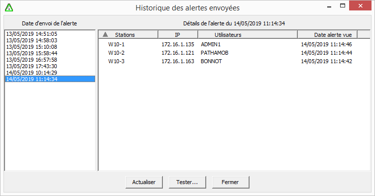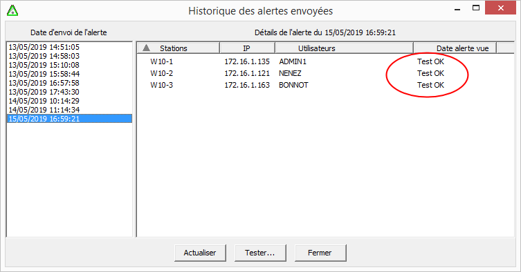 En utilisant le bouton "Tester..." les ordinateurs qui exécutent "AttendAlertes" répondent "Test Ok" sans intervention de l'utilisateur. Vous le voyez ensuite dans l'historique comme le montre la copie d'écran suivante :