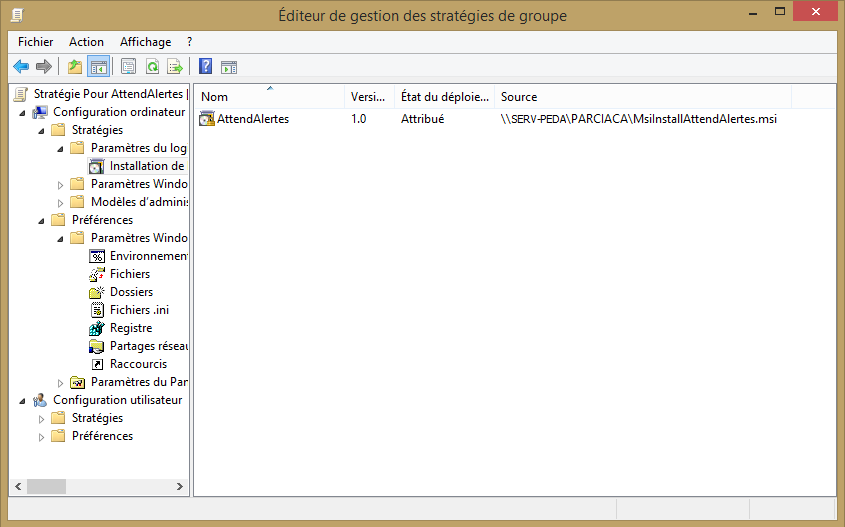 En supposant que votre serveur s'appelle SERV-PEDA et que vous avez placé le fichier MsiInstallAttendAlertes.msi dans le répertoire PARCIACA, le chemin à indiquer est \\SERV-PEDA\PARCIACA\MsiInstallAttendAlertes.msi Indiquez bien sûr le nom réel de votre serveur. La deuxième action est terminée, vous pouvez fermer l'éditeur de gestion des stratégies de groupe. |