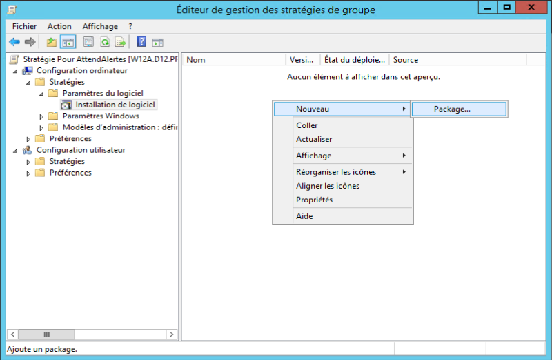 Pour que le programme AttendAlertes soit automatiquement installé sur les ordinateurs, créez un nouveau package comme indiqué sur le copie d'écran. |