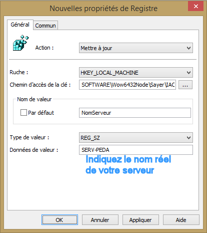 SOFTWARE\Wow6432Node\Sayer\IACA\AttendAlertes Indiquez comme nom de valeur : NomServeur Remplacez SERV-PEDA par le nom réel de votre serveur IACA La première action est terminée. |